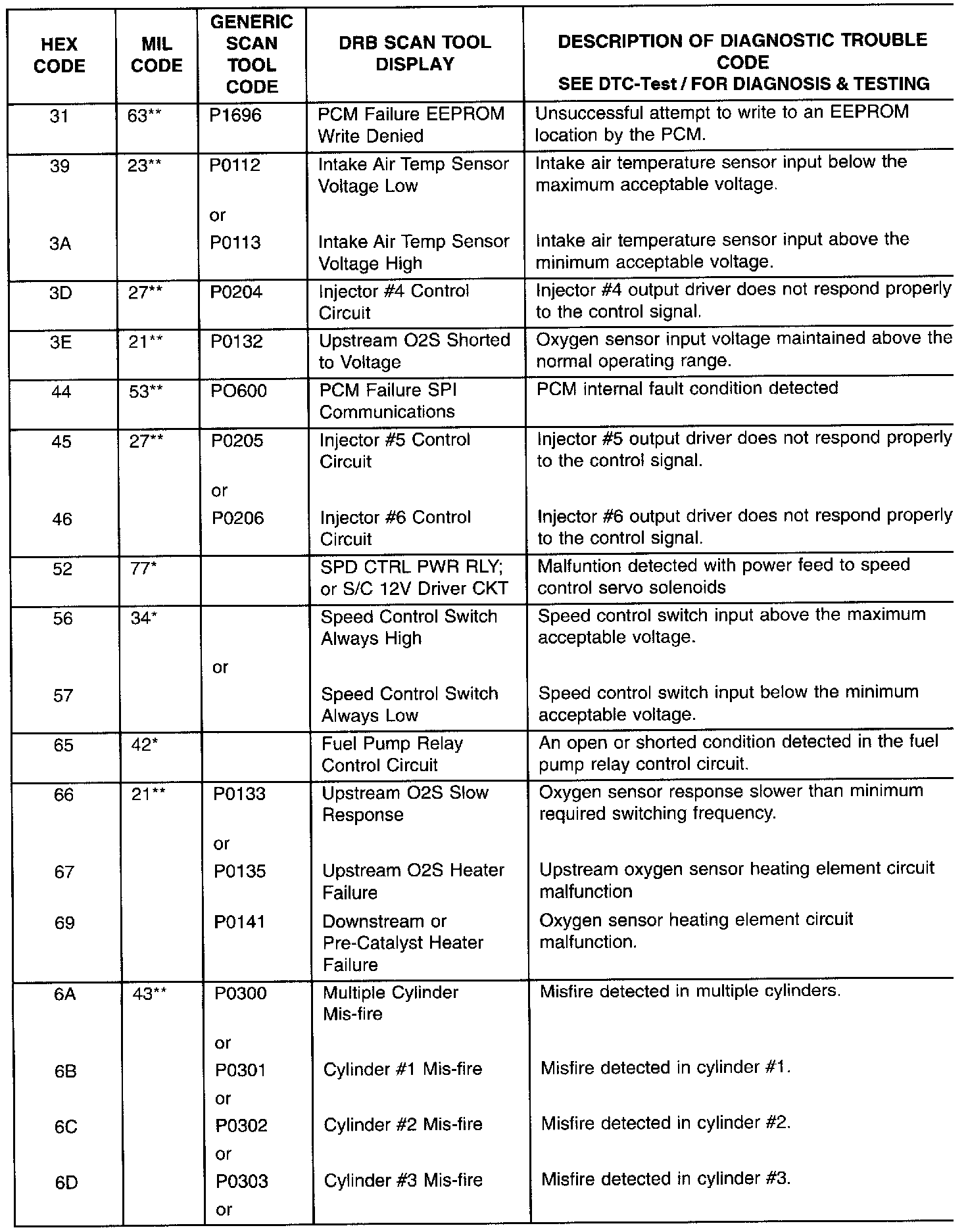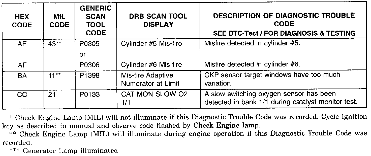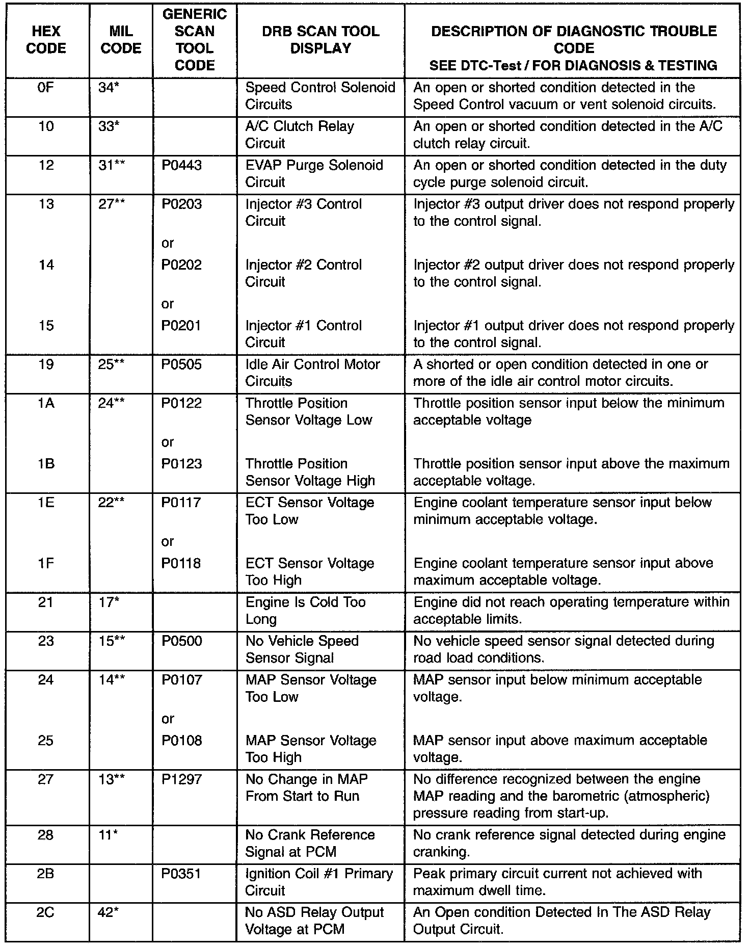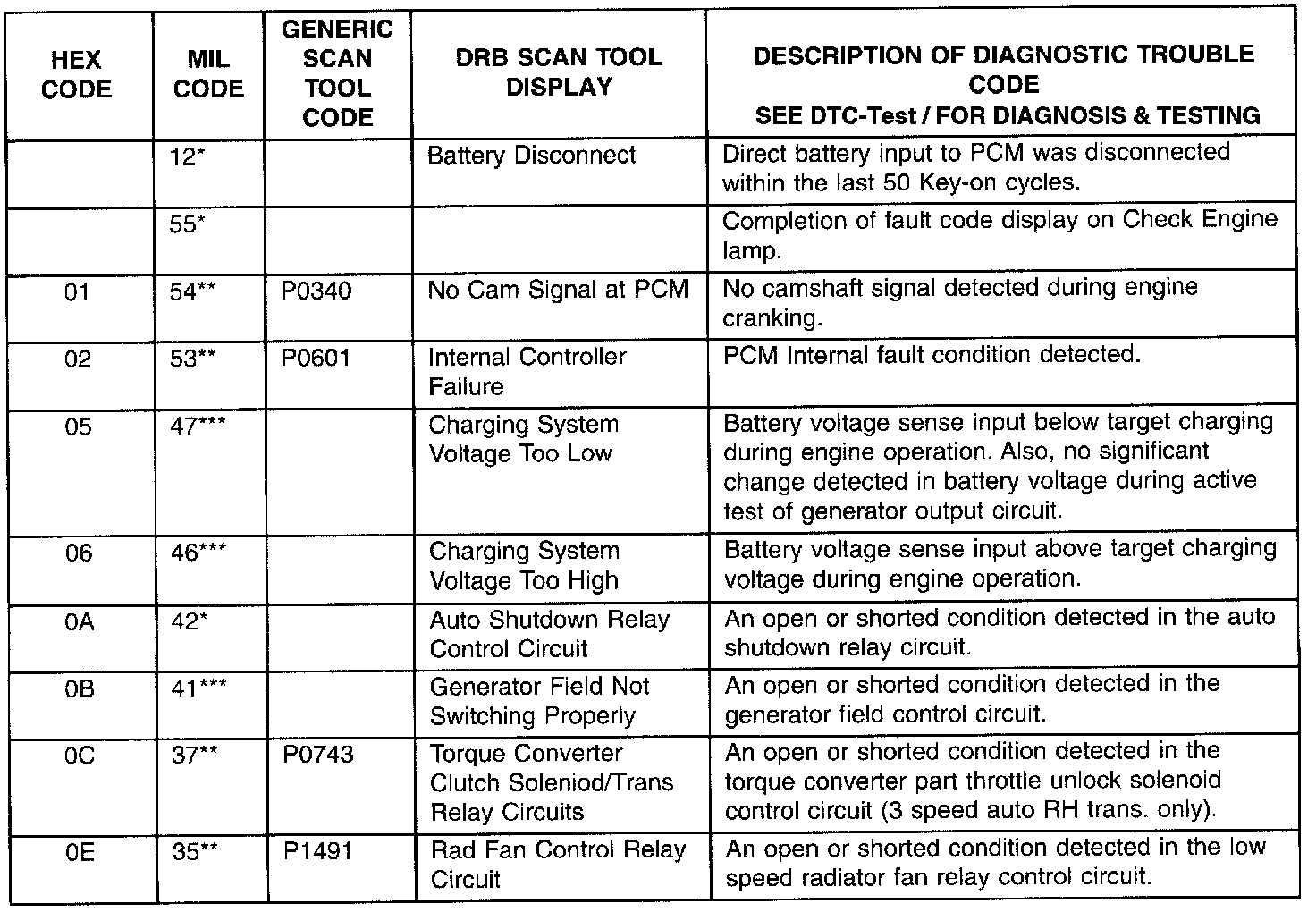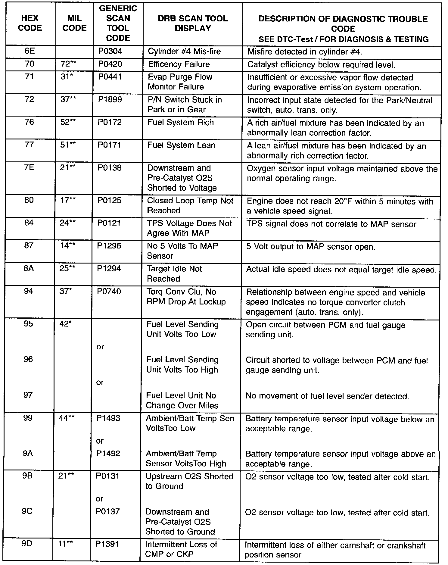 The technician can display DTC's in two ways. The first way is to cycle the ignition switch and count the number of times the malfunction indicator (Check Engine) lamp on the instrument panel flashes on and off. The DRB scan tool provides the second method of displaying DTC's. Diagnostic trouble codes are the results of a system or circuit failure, but do not directly identify the failed component or components.