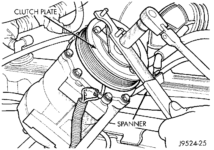 3. Remove the compressor mounting bolts and lift the compressor from the mounting bracket. Support the compressor to work on the clutch.