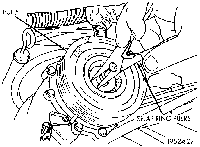 CAUTION: If the snap ring is not fully seated in the groove it will vibrate out, resulting in a clutch failure and severe damage to the front housing of the compressor.