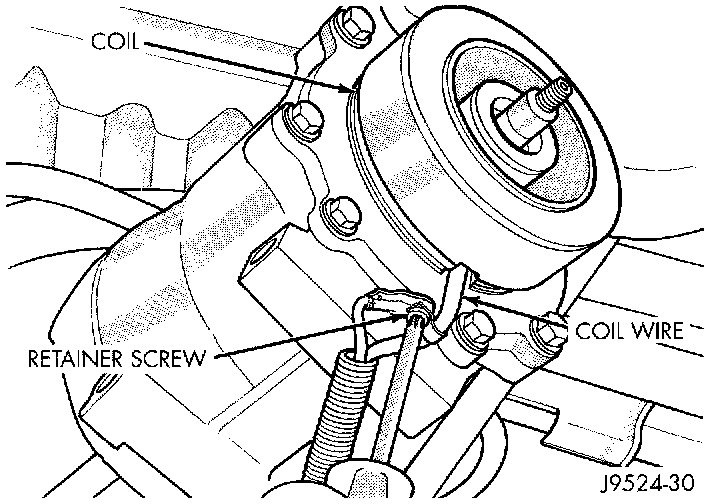 10. Remove the screw and retainer from the clutch coil lead wire harness on the compressor front housing.