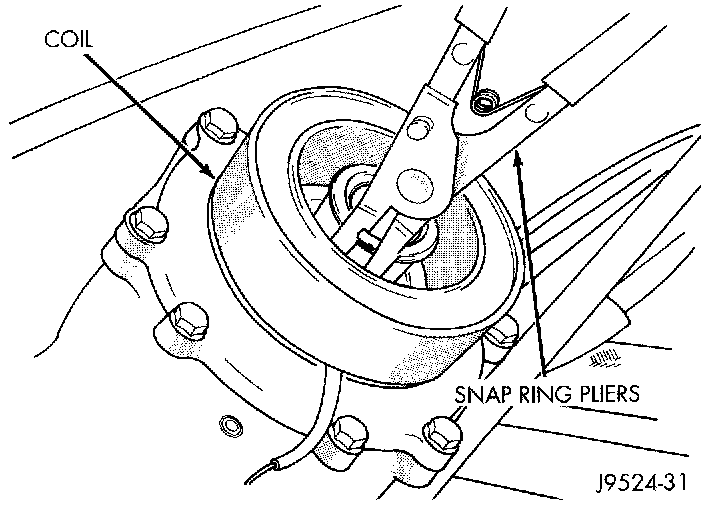11. Remove the snap ring from the compressor hub and remove the clutch field coil. Slide the clutch field coil off of the compressor hub.