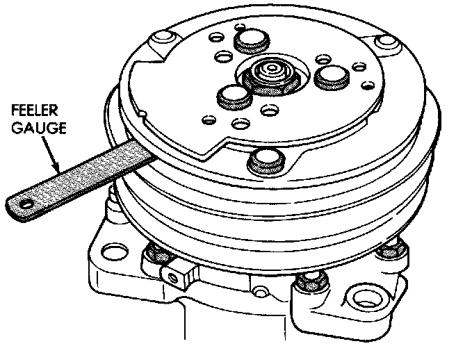 NOTE: The air gap is determined by the spacer shims. When installing an original, or a new clutch assembly, try the original shims first. When installing a new clutch onto a compressor that previously did not have a clutch, use 0.040, 0.020, and 0.005 shims from the clutch hardware package that is provided with the new clutch.