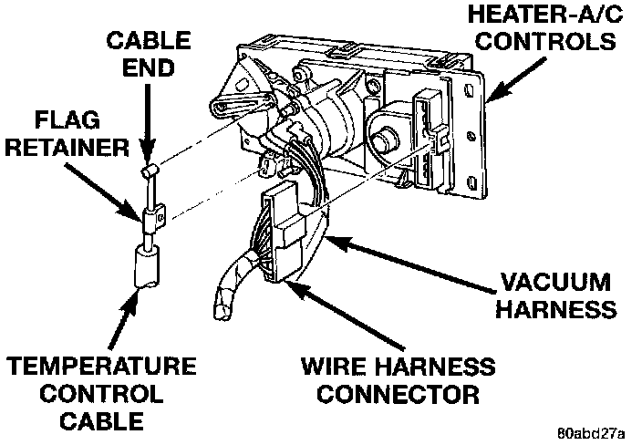 2. Snap the temperature control cable housing flag retainer into the receptacle on the back of the heater-A/C controls.