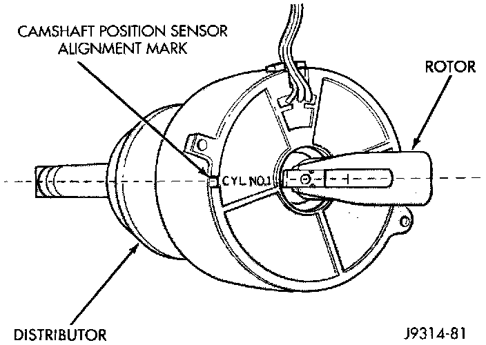 10. The distributor rotor should now be aligned to the CYL. NO. 1 alignment mark (stamped) into the camshaft position sensor (Fig. 34). If not, rotate the crankshaft through another complete 360 degree turn. Note the position of the number one cylinder spark plug cable (on the cap) in relation to rotor. Rotor should now be aligned to this position.
