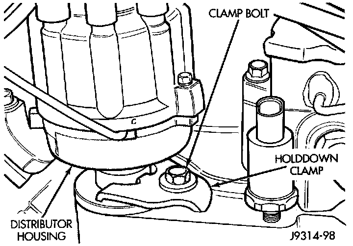 5. Install distributor holddown clamp and clamp bolt. Do not tighten bolt at this time.