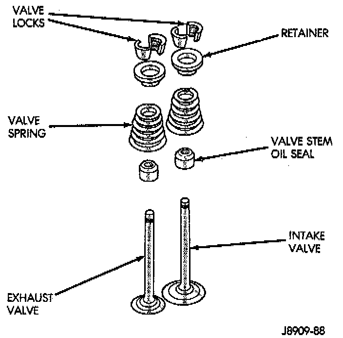 ^ Each valve spring is held in place by a retainer and a set of conical valve locks. The locks can be removed only by compressing the valve spring.