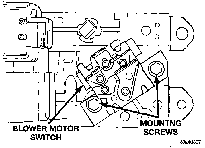 4. Remove the two screws securing the blower motor switch to the rear of the heater-A/C control and remove the switch.