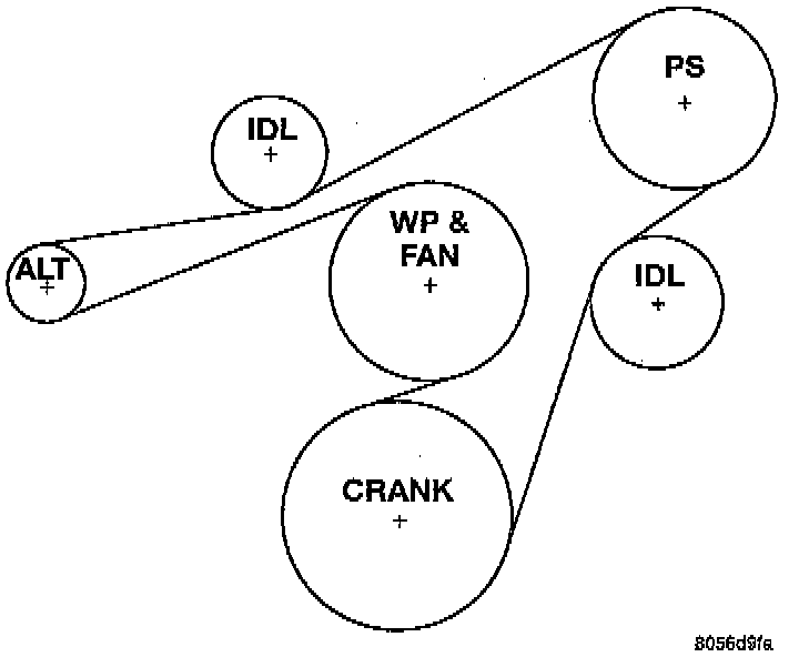 NOTE: Belt tension is adjusted at the power steering pump bracket and idler pulley assembly.