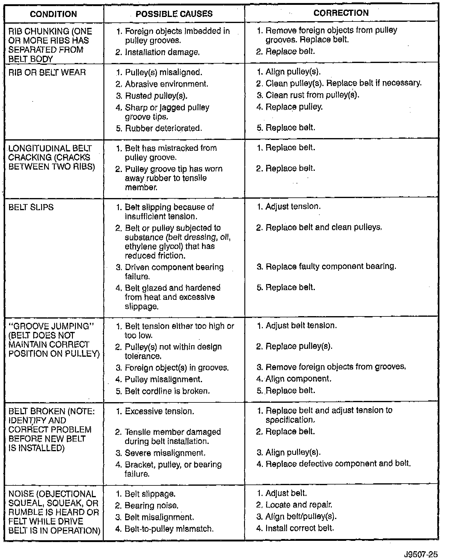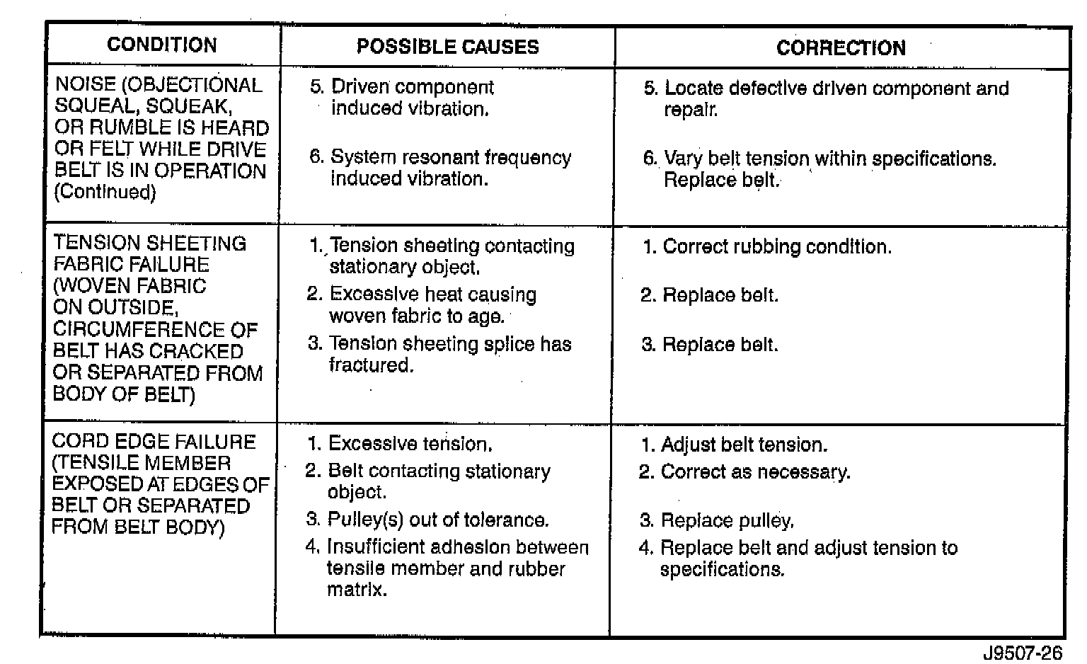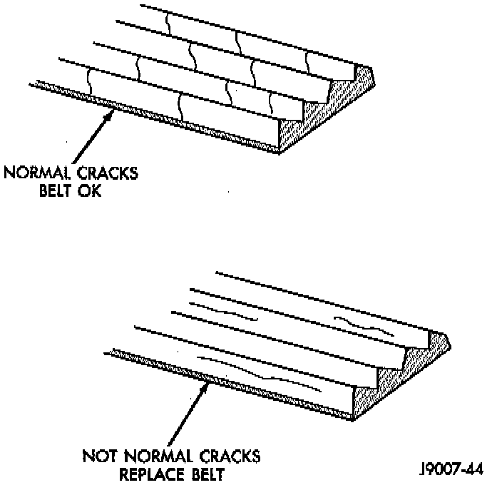 When diagnosing serpentine drive belts, small cracks that run across ribbed surface of belt from rib to rib, are considered normal. These are not a reason to replace belt. However, cracks running along a rib (not across) are not normal. Any belt with cracks running along a rib must be replaced. Also replace belt if it has excessive wear, frayed cords or severe glazing.