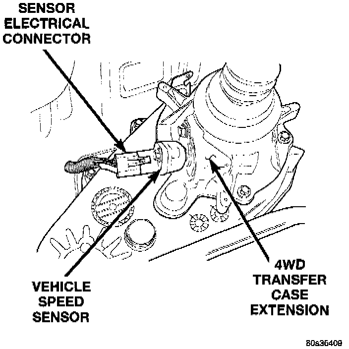 The vehicle speed sensor is located on the speedometer pinion gear adapter. The pinion gear adapter is located on the transfer case extension (drivers side) (Fig. 46).