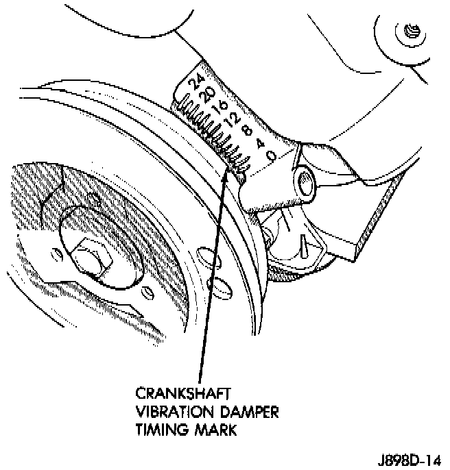 7. Slowly continue to rotate the engine. Do this until the timing index mark on the vibration damper pulley aligns with the top dead center (TDC) mark (0 degree) on timing degree scale (Fig. 44). Always rotate the engine in direction of normal rotation. Do not rotate the engine backward to align the timing marks.