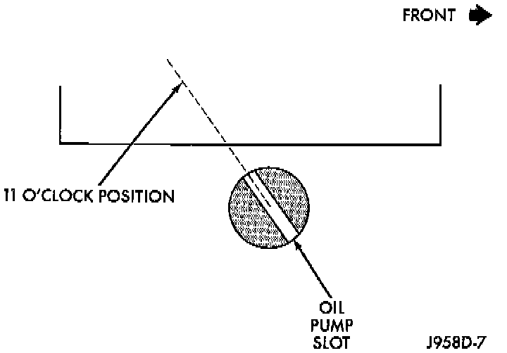 13. Observe the slot in the oil pump gear through the hole on the side of the engine. It should be slightly before (counterclockwise of) the 11 o'clock position (Fig. 46).
