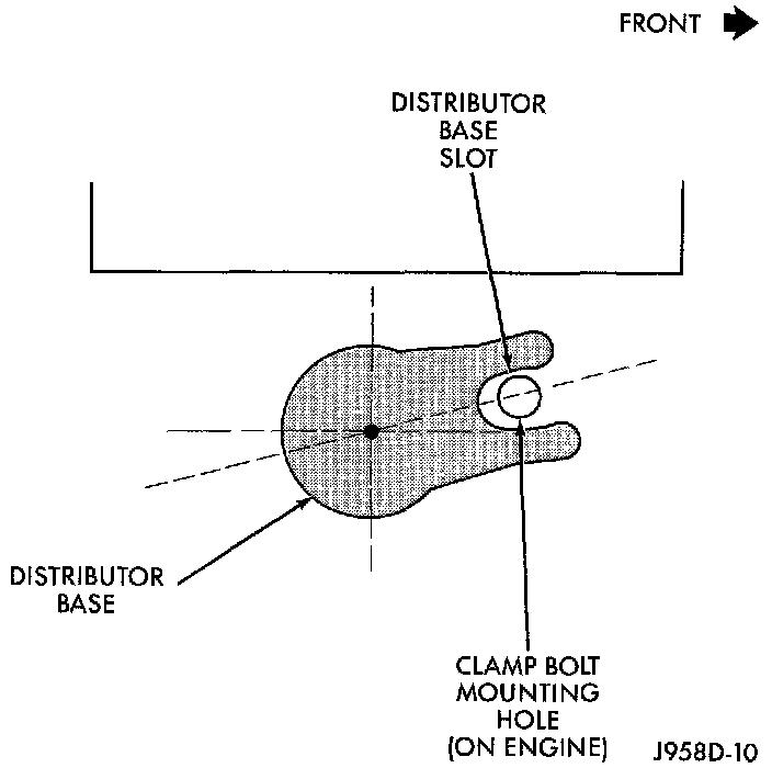 ^ the centerline of the slot at the base of the distributor is aligned to the centerline of the distributor hold-down bolt hole on the engine. In this position, the hold-down bolt should easily pass through the slot and into the engine.