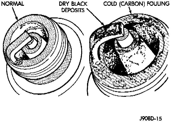 Cold fouling is sometimes referred to as carbon fouling. The deposits that cause cold fouling are basically carbon (Fig. 24). A dry, black deposit on one or two plugs in a set may be caused by sticking valves or defective spark plug cables. Cold (carbon) fouling of the entire set of spark plugs may be caused by a clogged air cleaner element or repeated short operating times (short trips).