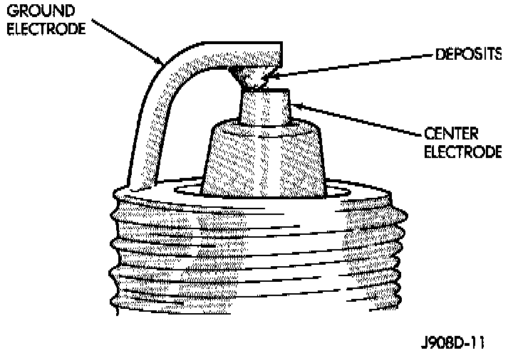 Electrode gap bridging may be traced to loose deposits in the combustion chamber. These deposits accumulate on the spark plugs during continuous stop-and-go driving. When the engine is suddenly subjected to a high torque load, deposits partially liquefy and bridge the gap between electrodes (Fig. 26). This short circuits the electrodes. Spark plugs with electrode gap bridging can be cleaned using standard procedures.