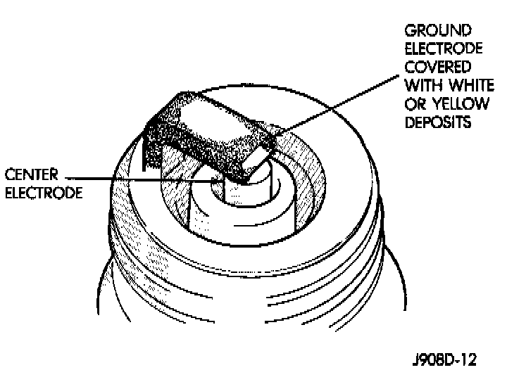 Fuel scavenger deposits may be either white or yellow (Fig. 27). They may appear to be harmful, but this is a normal condition caused by chemical additives in certain fuels. These additives are designed to change the chemical nature of deposits and decrease spark plug misfire tendencies. Notice that accumulation on the ground electrode and shell area may be heavy, but the deposits are easily removed. Spark plugs with scavenger deposits can be considered normal in condition and can be cleaned using standard procedures.