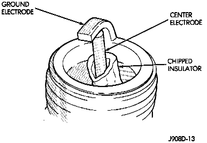 A chipped electrode insulator usually results from bending the center electrode while adjusting the spark plug electrode gap. Under certain conditions, severe detonation can also separate the insulator from the center electrode (Fig. 28). Spark plugs with this condition must be replaced.