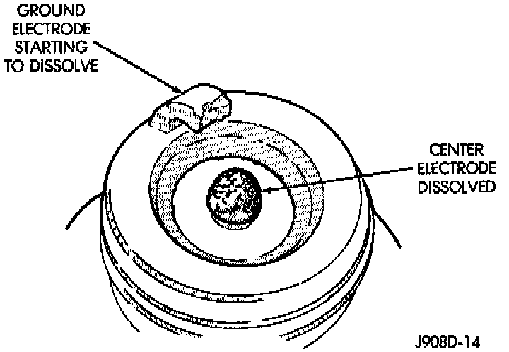 Preignition damage is usually caused by excessive combustion chamber temperature. The center electrode dissolves first and the ground electrode dissolves somewhat latter (Fig. 29). Insulators appear relatively deposit free. Determine if the spark plug has the correct heat range rating for the engine. Determine if ignition timing is over advanced or if other operating conditions are causing engine overheating. (The heat range rating refers to the operating temperature of a particular type spark plug. Spark plugs are designed to operate within specific temperature ranges. This depends upon the thickness and length of the center electrodes porcelain insulator.)