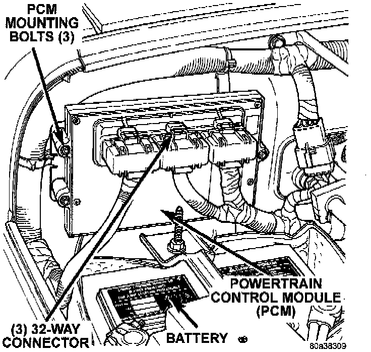 The ignition system is controlled by the Powertrain Control Module (PCM) which is located in the engine compartment (Fig. 1).