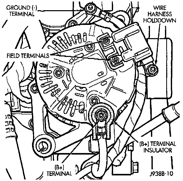 3. Remove nuts from harness hold-down, battery terminal, ground terminal and 2 field minals. Remove wire connectors.