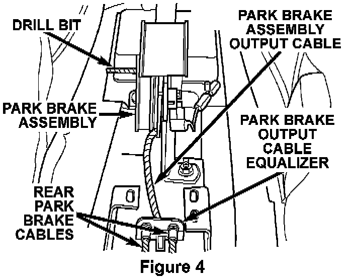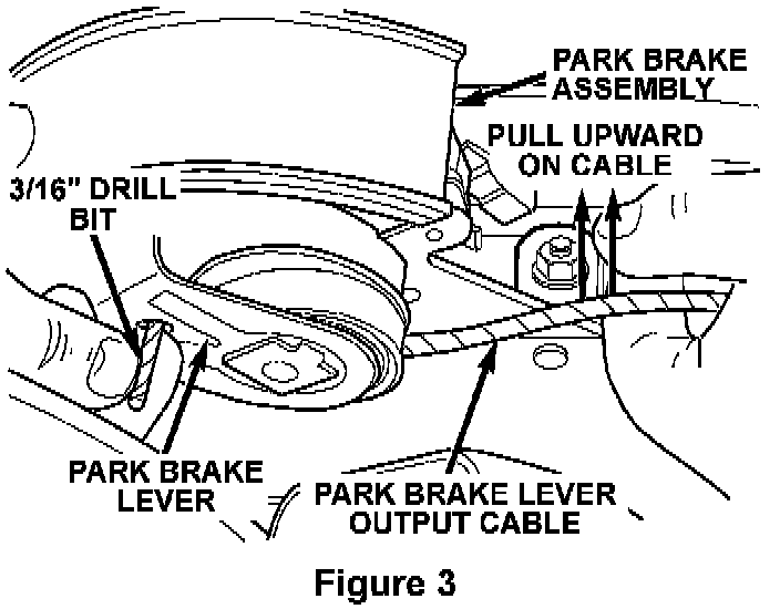 9. Grasp the park brake lever output cable by hand and pull upward until a 3/16" drill bit can be inserted into the handle and sector gear mechanism (Figure 3). This will remove the tension from the park brake cables.