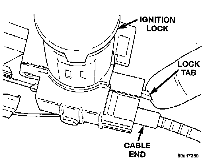 2. Insert cable end into opening in steering column hub under ignition lock. Push cable inward until lock tab engages.