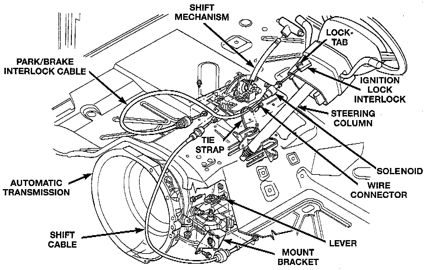 1. Route replacement cable behind instrument panel and under floor console area to shift mechanism.