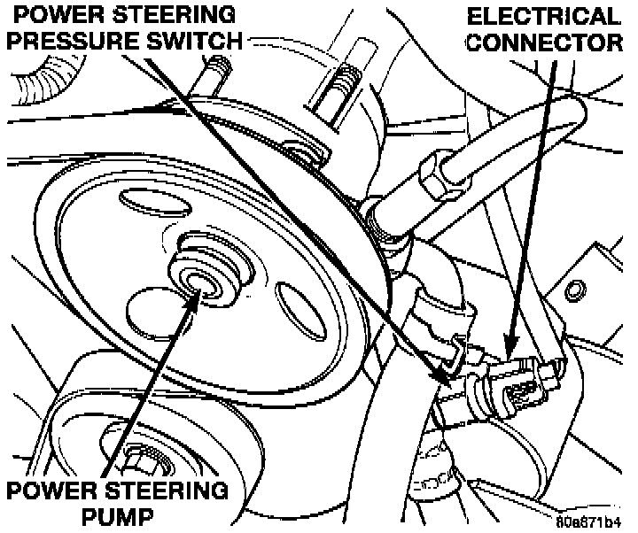 A pressure sensing switch is included in the power steering system (mounted on the high-pressure line). This switch will be used only on vehicles equipped with power steering. The switch provides an input to the Powertrain Control Module (PCM). This input is provided during periods of high pump load and low engine rpm such as during parking maneuvers. The PCM will then increase the idle speed through the Idle Air Control (IAC) motor. This is done to prevent the engine from stalling under the increased load.
