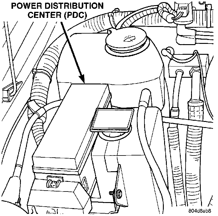 A 12 volt signal at this input indicates to the PCM that the ASD has been activated. The ASD relay is located in the Power Distribution Center (PDC). The PDC is located in the engine compartment (Fig. 2). Refer to label on PDC cover for relay location. The relay is used to connect the oxygen sensor heater elements, ignition coil, generator field winding and fuel injectors to 12 volt + power supply.