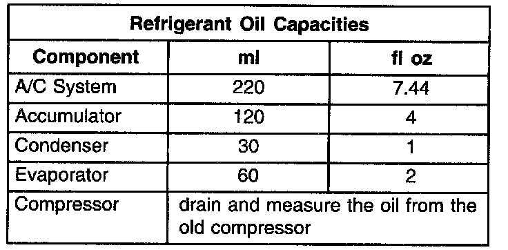 Refrigerant oil must be added when a accumulator, evaporator coil, or condenser are replaced. See the Refrigerant Oil Capacities chart. When a compressor is replaced, the refrigerant oil must be drained from the old compressor and measured. Drain all of the refrigerant oil from the new compressor, then fill the new compressor with the same amount of refrigerant oil that was drained out of the old compressor.
