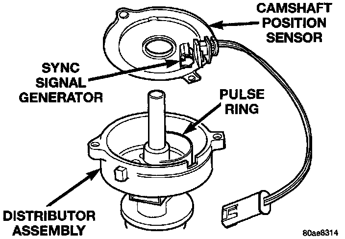 The sensor contains a hall effect device called a sync signal generator to generate a fuel sync signal. This sync signal generator detects a rotating pulse ring (shutter) on the distributor shaft. The pulse ring rotates 180 degrees through the sync signal generator. Its signal is used in conjunction with the crankshaft position sensor to differentiate between fuel injection and spark events. It is also used to synchronize the fuel injectors with their respective cylinders.