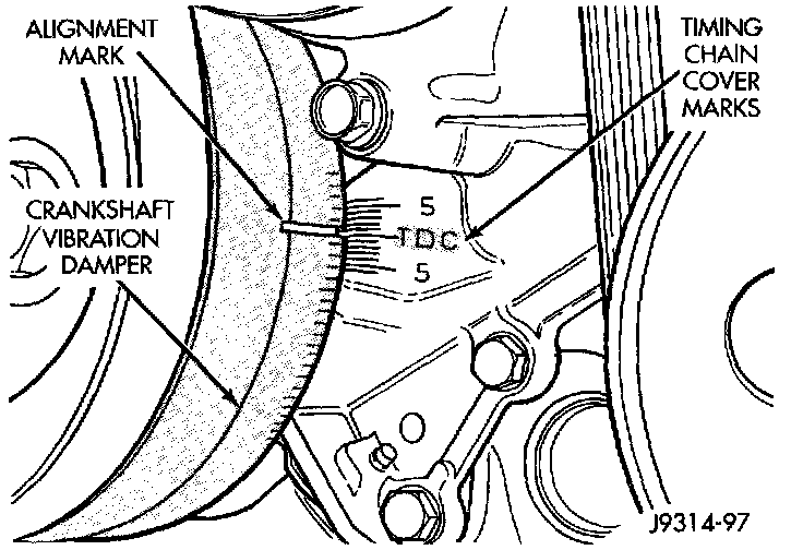 9. Slowly rotate engine clockwise, as viewed from front, until indicating mark on crankshaft vibration damper is aligned to 0 degree (TDC) mark on timing chain cover.