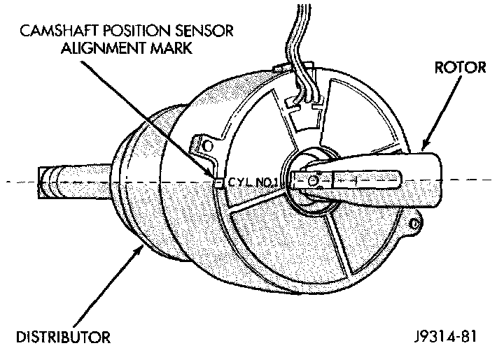 10. The distributor rotor should now be aligned to CYL. NO. 1 alignment mark (stamped) into camshaft position sensor. If not, rotate crankshaft through another complete 360 degree turn. Note position of number one cylinder spark plug cable (on the cap) in relation to rotor. Rotor should now be aligned to this position.