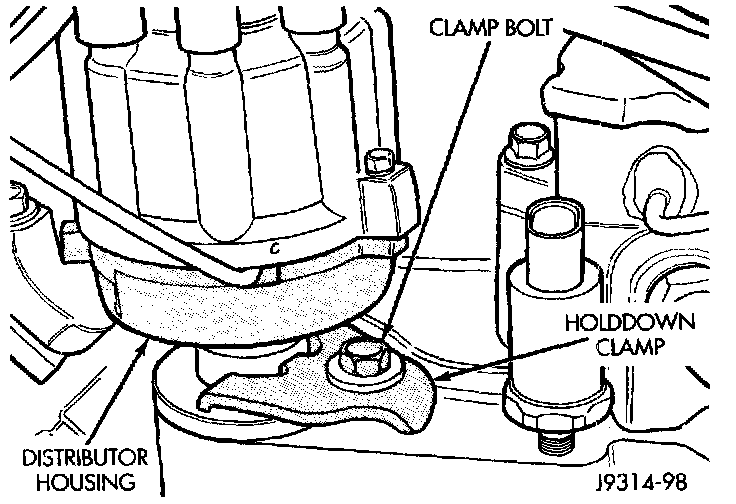 5. Install distributor holddown clamp and clamp bolt. Do not tighten bolt at this time.