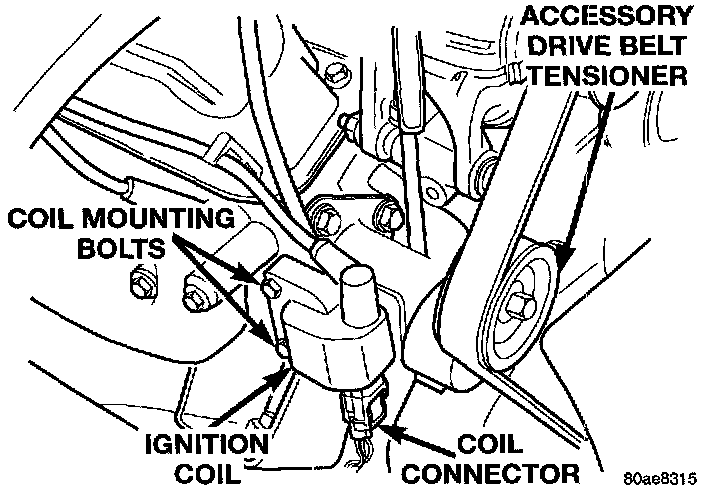 WARNING: DO NOT REMOVE THE COIL MOUNTING BRACKET-TO-CYLINDER HEAD MOUNTING BOLTS. THE COIL MOUNTING BRACKET IS UNDER ACCESSORY DRIVE BELT TENSION. IF THIS BRACKET IS TO BE REMOVED FOR ANY REASON, ALL BELT TENSION MUST FIRST BE RELIEVED.