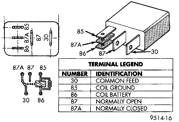 1. A relay in the de-energized position should have continuity between terminals 87A and 30, and no continuity between terminals 87 and 30. If OK, go to Step 2. If not OK, replace the faulty relay.
