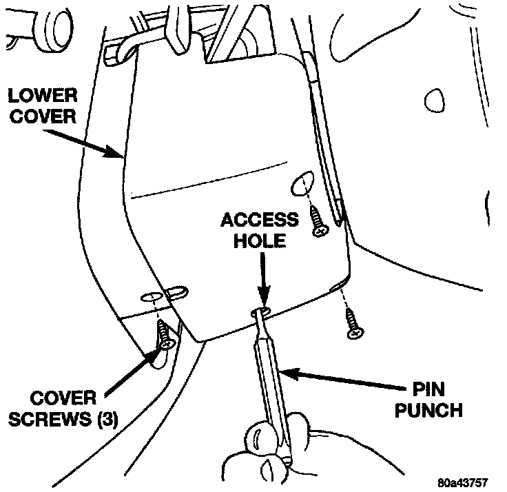 5. Position a small screwdriver or pin punch into tang access hole on bottom of steering column lower cover.