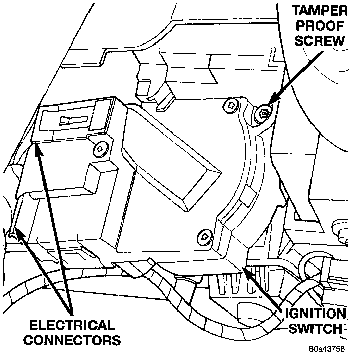 4. Remove ignition switch mounting screw. Use tamper proof torx bit (Snap-On(R) SDMTR10 or equivalent) to remove the screw.