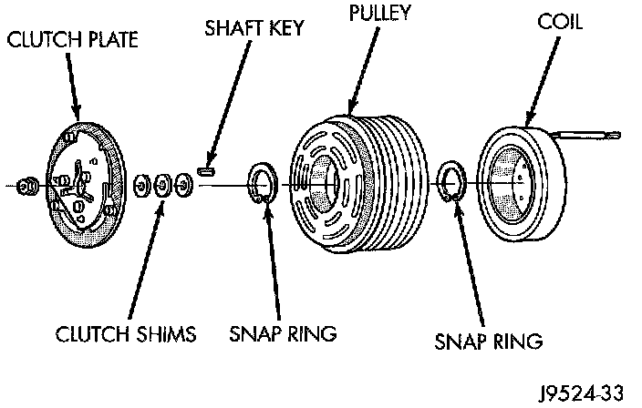The compressor clutch assembly consists of a stationary electromagnetic coil, a hub bearing and pulley assembly, and a clutch plate. The electromagnetic coil unit and the hub bearing and pulley assembly are each retained on the nose of the compressor front housing with snap rings. The clutch plate is keyed to the compressor shaft and secured with a nut.