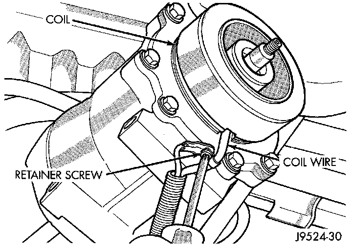 12. Remove the screw and retainer from the clutch coil lead wire harness on the compressor front housing.