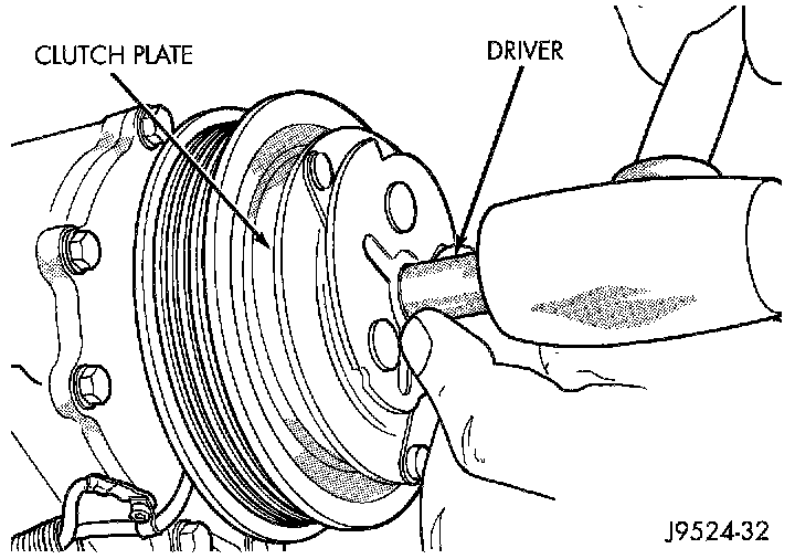 Examine the friction surfaces of the clutch pulley and the front plate for wear. The pulley and front plate should be replaced if there is excessive wear or scoring.