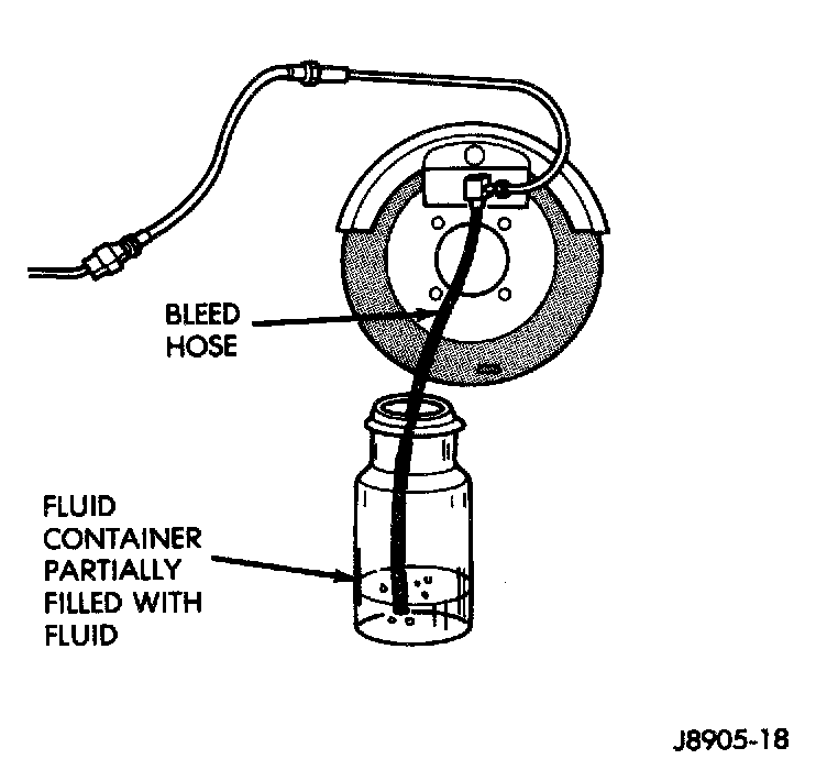3. Attach one end of bleed hose to bleed screw and insert opposite end in glass container partially filled with brake fluid. Be sure end of bleed hose is immersed in fluid.