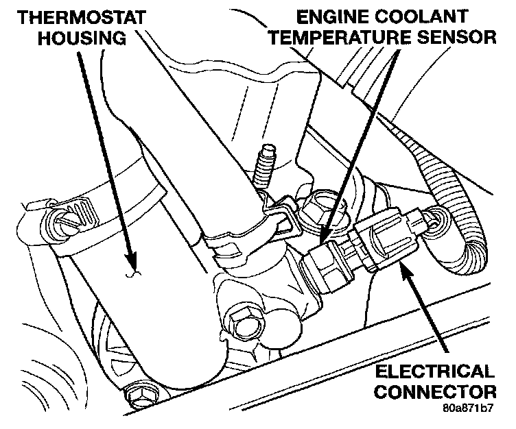 The engine coolant temperature sensor is installed in the thermostat housing and protrudes into the water jacket. The sensor provides an input voltage to the Powertrain Control Module (PCM) relating coolant temperature. The PCM uses this input along with inputs from other sensors to determine injector pulse width and ignition timing. As coolant temperature varies, the coolant temperature sensor's resistance changes. The change in resistance results in a different input voltage to the PCM.