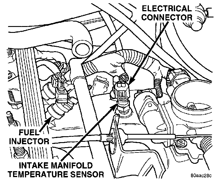 The intake manifold air temperature sensor is installed in the intake manifold with the sensor element extending into the air stream. The sensor provides an input voltage to the Powertrain Control Module (PCM) indicating intake manifold air temperature. The input is used along with inputs from other sensors to determine injector pulse width. As the temperature of the air-fuel stream in the manifold varies, the sensor resistance changes. This results in a different input voltage to the PCM.