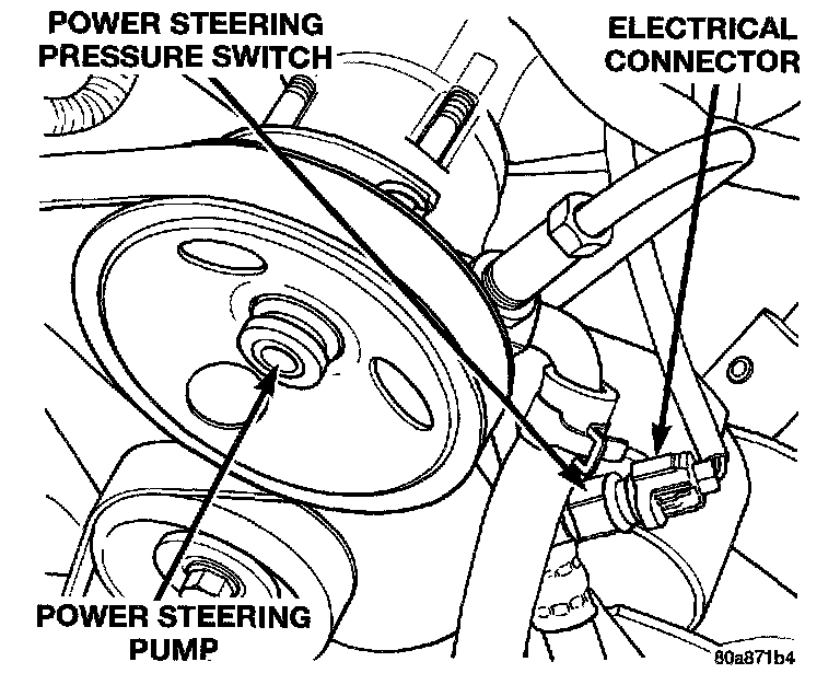 A pressure sensing switch is included in the power steering system (mounted on the high-pressure line). This switch will be used only on vehicles equipped with a 2.5L engine and power steering. The switch provides an input to the Powertrain Control Module (PCM). This input is provided during periods of high pump load and low engine rpm; such as during parking maneuvers. The PCM will then increase the idle speed through the Idle Air Control (IAC) motor. This is done to prevent the engine from stalling under the increased load.