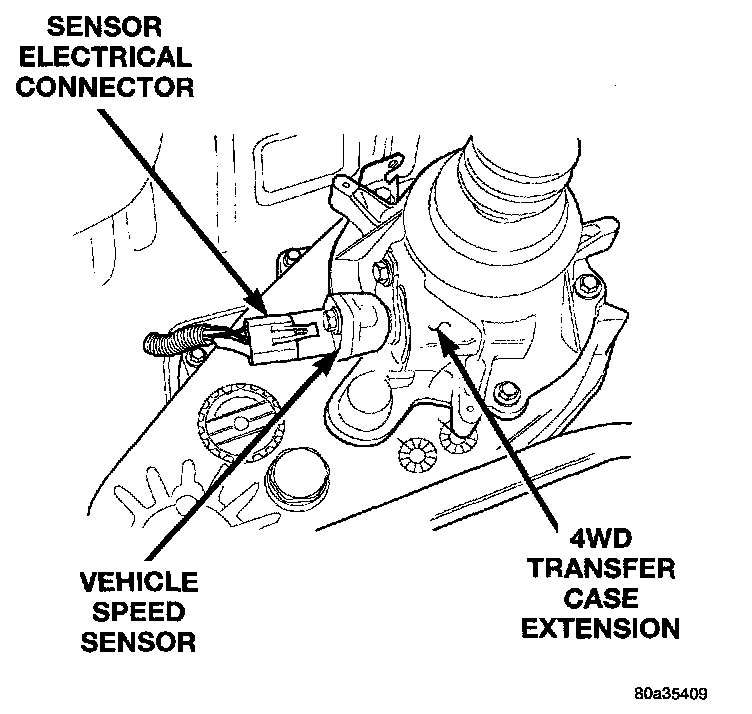 The vehicle speed sensor is located on the speedometer pinion gear adapter. The pinion gear adapter is located on the extension housing of the transmission (drivers side-2WD), or on the transfer case (4WD). The sensor input is used by the Powertrain Control Module (PCM) to determine vehicle speed and distance traveled.