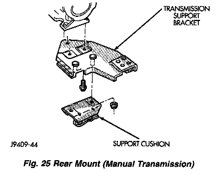 b. If necessary, remove the bolts holding the transmission support bracket to the transmission (Fig. 25). Remove bracket.