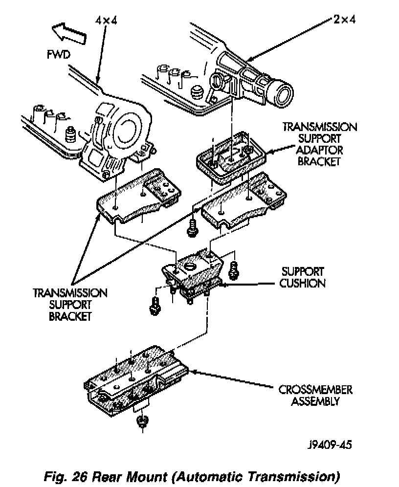 b. If necessary on 2WD vehicles, remove the bolts holding the transmission support adapter bracket to the transmission (Fig. 26). Remove the adapter bracket.