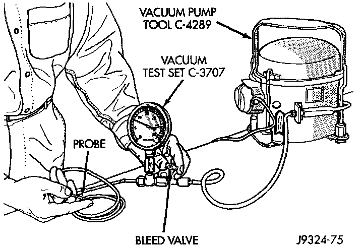 Use an adjustable vacuum test set (Special Tool C-3707-B) and a suitable vacuum pump to test the heater-A/C vacuum control system. With a finger placed over the end of the vacuum test hose probe, adjust the bleed valve on the test set gauge to obtain a vacuum of exactly 27 kPa (8 in. Hg.).