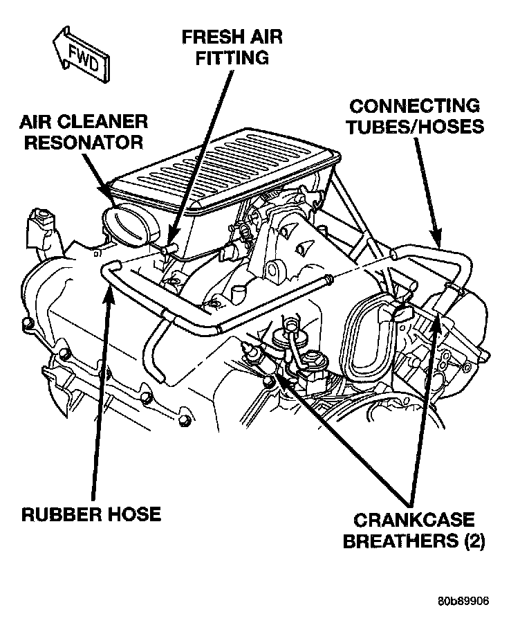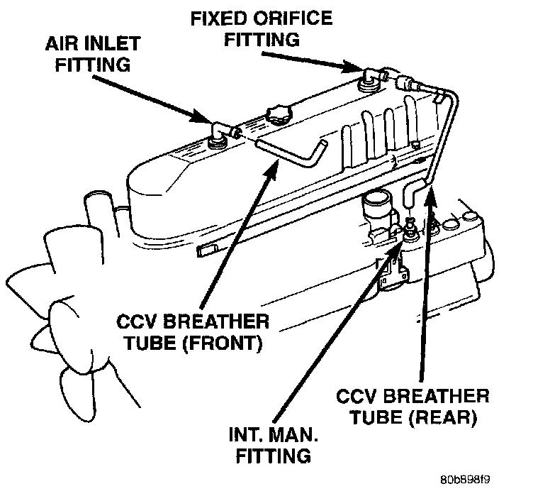 When the engine is operating, fresh air enters the engine and mixes with crankcase vapors. Engine vacuum draws the vapor/air mixture through the fixed orifice and into the intake manifold. The vapors are then consumed during engine combustion.